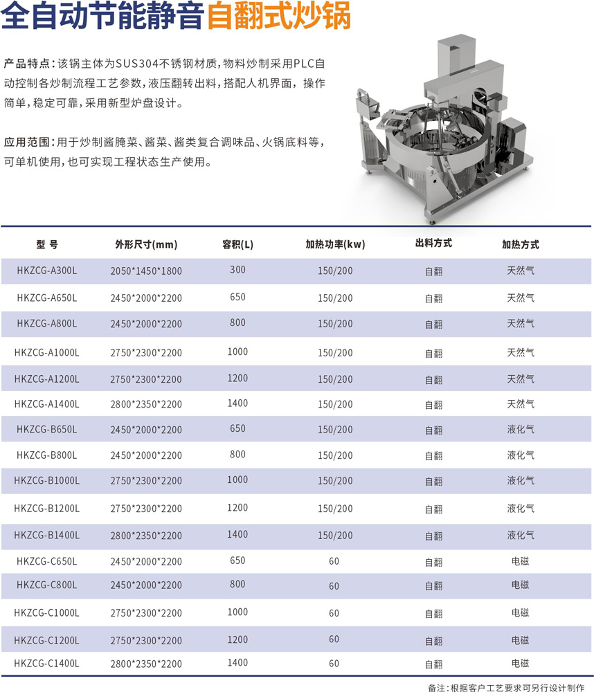 该锅主体为SUS304不锈钢材质,物料炒制采⽤PLC⾃动控制各炒制流程⼯艺参数,液压翻转出料,搭配⼈机界⾯, 操作简单,稳定可靠,采⽤新型炉盘设计。